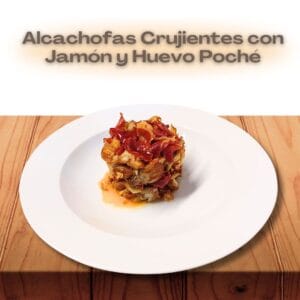Alcachofa confitada, rellena de gambitas y verduras pochadas, bañadas en brandy sobre superficie, simulando «Les Rotes» de Dénia